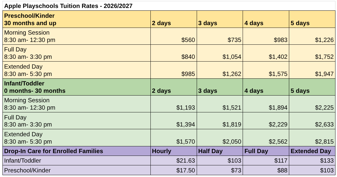 Tuition rates apply to all Apple Playschools infant, toddler, and preschool programs. Tuition is based on a child’s schedule and the contract length a family chooses. Families have the option to choose from several different contract options. This increases the tuition rate accordingly.*